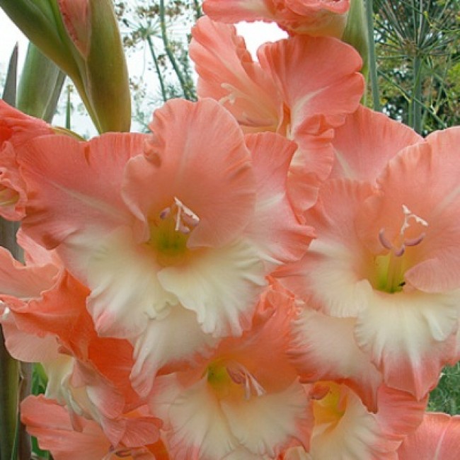 Луковицы гладиолуса крупноцветкового Пинк Соледо (Gladiolus Pink Soledo) позволят получить необычные по форме цветки нежного окраса. Высота здорового растения может достигать 150 сантиметра в высоту. В этом случае требуется подвязка стебля. Цветки с неодинаковыми долями, окрашенные в пастельный розовый цвет. Один лепесток отличается – он более гофрированный и окрашен в светло-оранжевый цвет. Растение хорошо развивается на любой почве при условии хорошего дренажа. Предпочитает солнечные зоны, защищенные от воздействия ветра. На зимний сезон луковицы выкапывают и хранят в сухом прохладном месте.