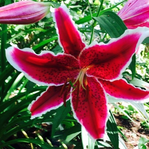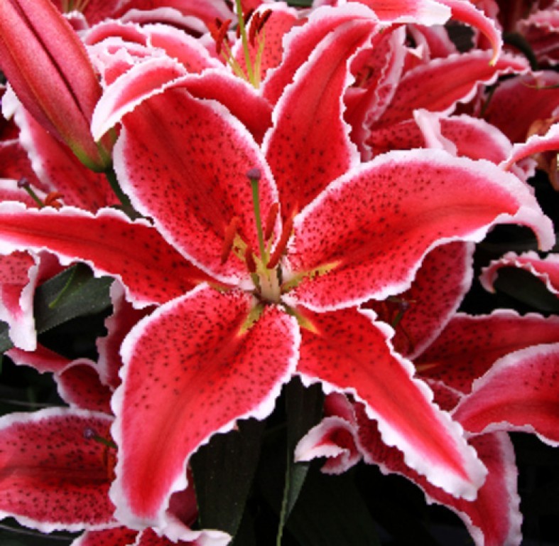 • Окраска цветка : ярко-малиновый с темным крапом и белой каймой по краям