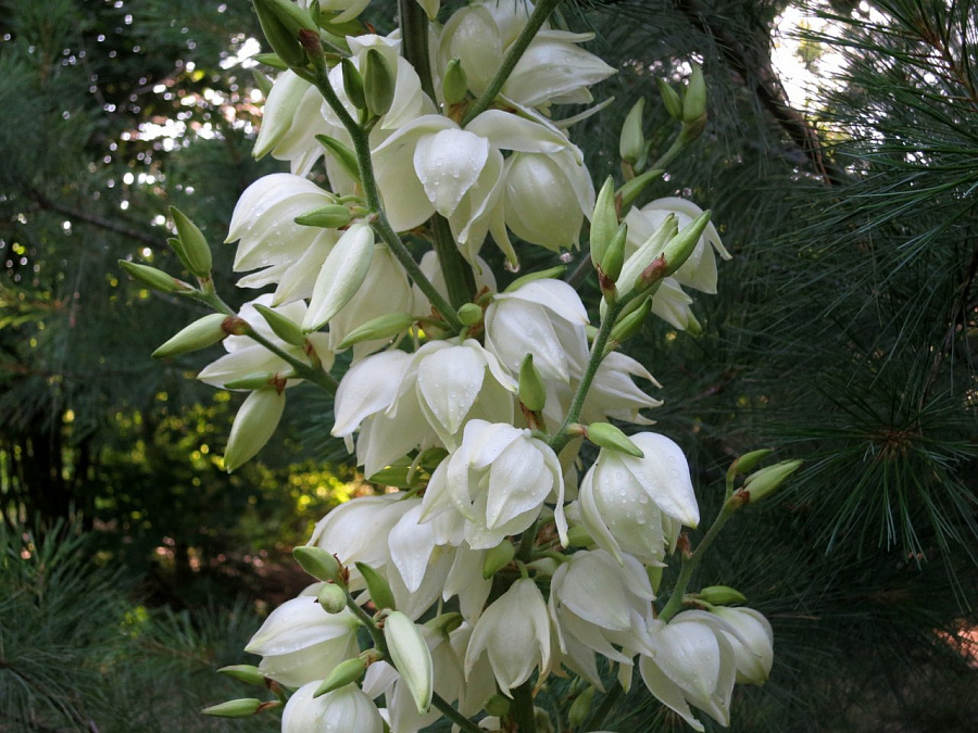 Саженцы юкки нитчатой – вне конкуренции, так как это бесстебельное растение, имеет сизо-зеленые листья,длинной 70 см и желтоватые цветы,размер которых 8 см,собранные в пышное соцветие, достигающее двухметровой высоты. Особенности растения, которые важно знать при покупке саженцев и крупномеров: высокие показатели морозостойкости; важен хороший дренаж, отсутствие переувлажнения; желательна легкая почва, подкормка органическими и минеральными удобрениями. Юкку размножают корневыми отпрысками, так как семена не всходят без опыления искусственным путем.